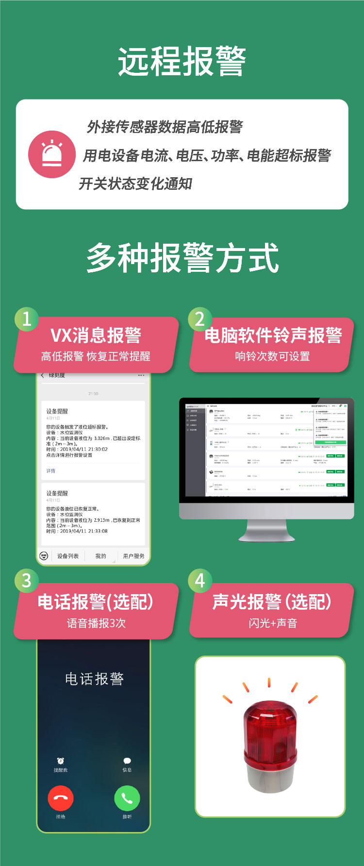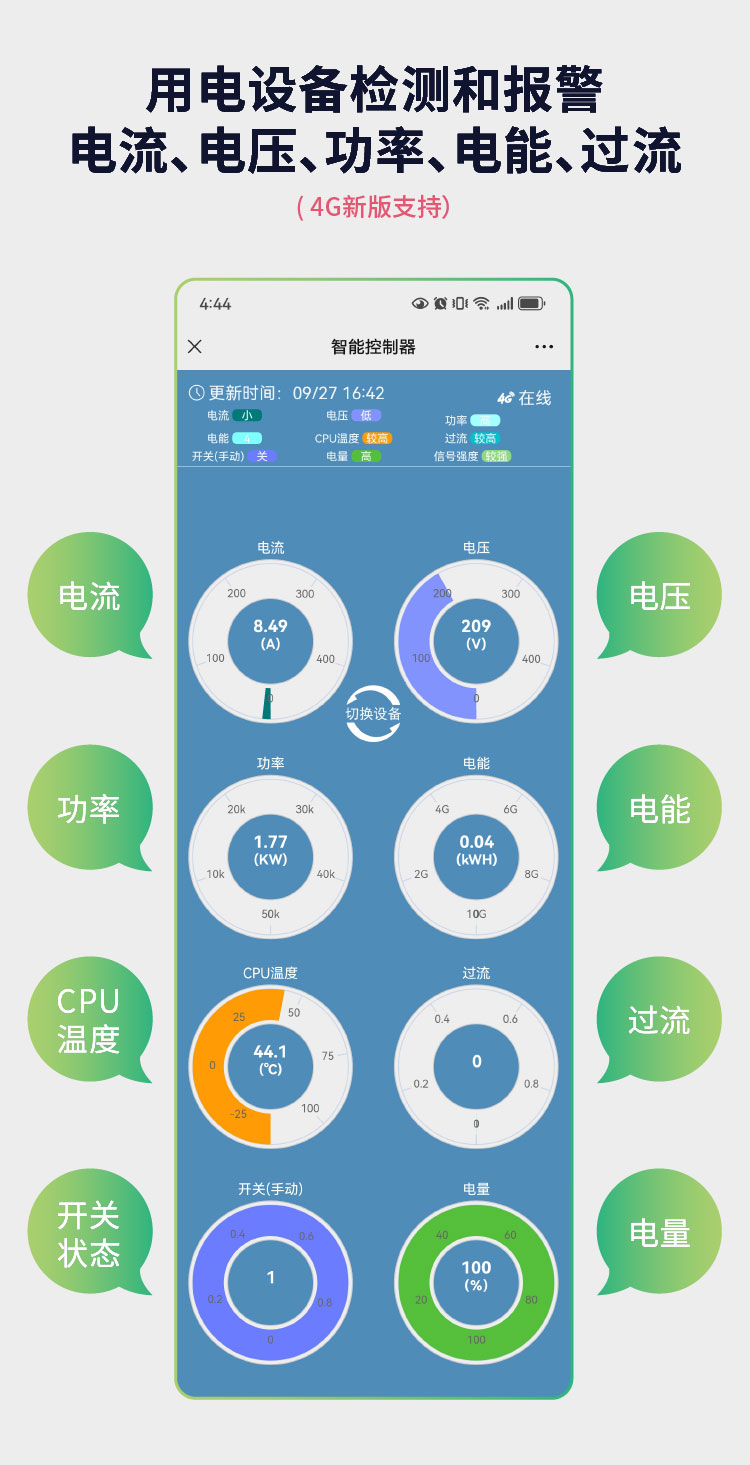 智能插座远程控制器采用 WiFi 或 4G 联网方式,设备与云端服务器通信,可实现手机、电脑远程控制开关,多种控制模式可随时切换,包括远程控制开关、自动定时开关、自动控制、云联控制。可外接传感器实现远程监测传感器数据,并联动开关,可应用于农业中温湿度的控制、自动控制通风、灌溉、补光,工业中水泵、阀门、风机等各种用电设备的自动控制场景。